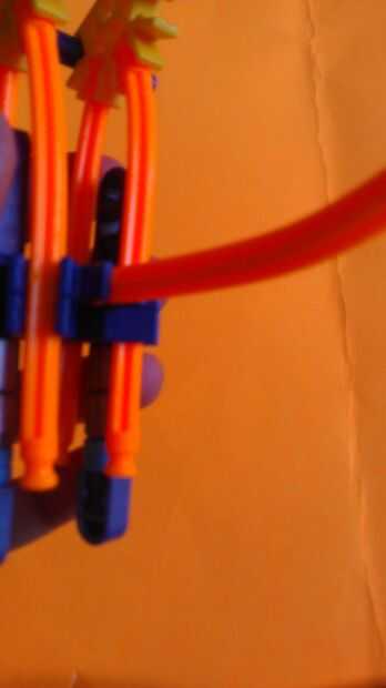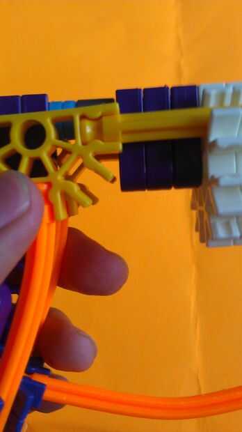 Añadir la barra naranja a la conexión superior. A continuación, fije los amarillos a las barras amarillas en el barril. A continuación, conecte la barra naranja al cañón como se muestra.
