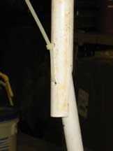 Cortar dos 17" piezas de 1/2" PVC (piernas). Taladre orificios como se muestra en las fotos, luego usando una brida, coloque la pierna superior e inferior como se muestra.