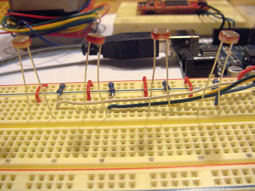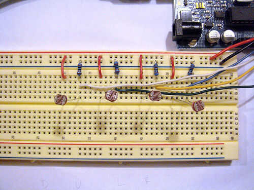 Arduino. De izquierda a derecha, conectar las patas de la tierra de las fotocélulas a pernos