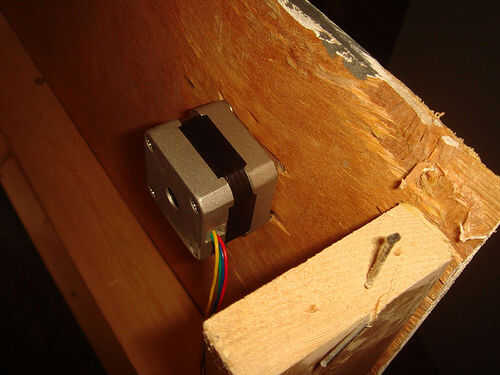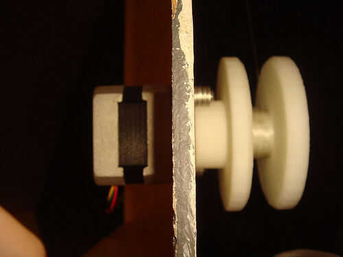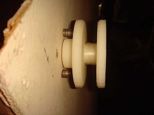 motor se montará con. Utilice la broca de taladro de 3/8 para perforar el agujero de centro. Retire los tornillos que viene con el motor del lado del eje para que podamos utilizar esos agujeros como los agujeros con los tornillos más largos de montaje.  Ahora instalar sus motores con los tornillos M3, bloquear las arandelas y crear un sándwich con su tablero de la lona. Puede que necesite menos arandelas, dependiendo del grosor de la Junta que está utilizando.