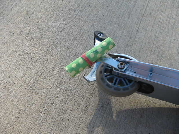 casa de mi hijo arrastrado un poco doblado encima de la vespa de empuje que encontró en el lado de la carretera.  Tenía ruedas pequeñas que no podrían rodar en la arena y el marco de la raspada en cada baño y el agujero.Decidimos que no era el ajuste