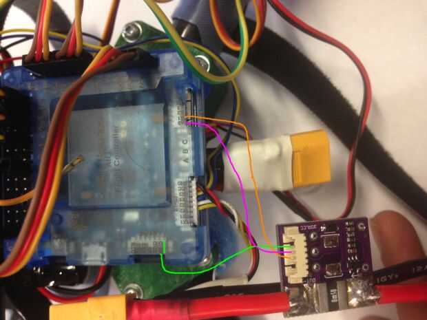 2) el cable que va desde el pin de módulo de potencia 4 necesita pin goto el FC de sentido actual, en tableros de AIO su marcada A0 sensor/divisor de tensión. En la imagen arriba de mi Hobby King MultiWii y Megapirate AIO (hobby Reyes Crius AIO clon) es el perno inferior en el conector en el enchufe hembra blanco superior.
