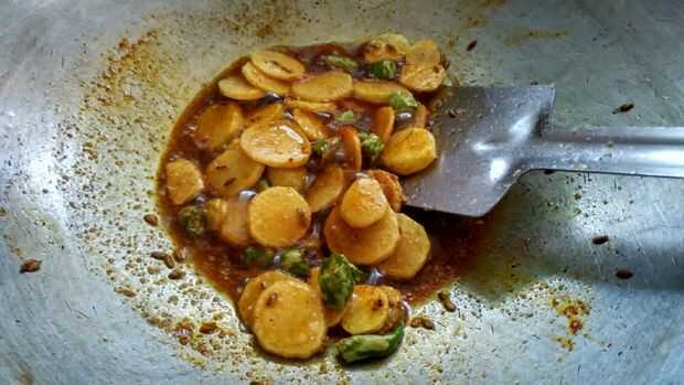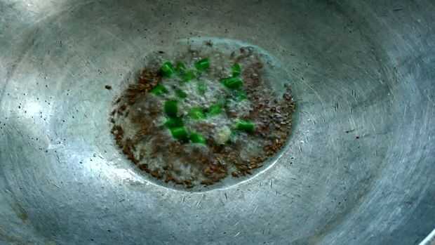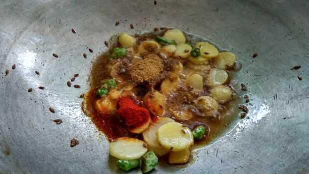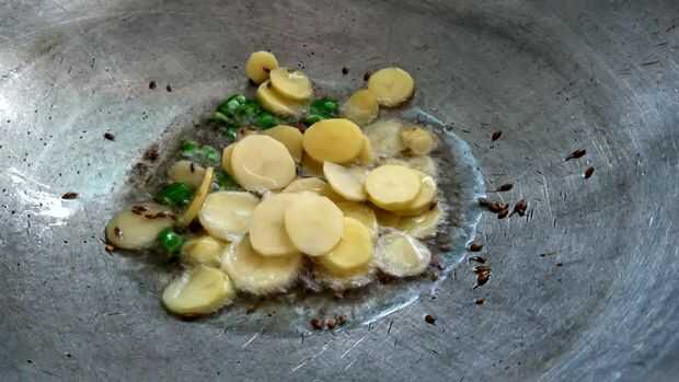 6. calentar el ghee en una sartén profunda y cuando ghee calor añadir comino y dejar hasta el crujido agregar chiles verdes picados y cortar patatas y saltear hasta que las patatas estén cocidas.