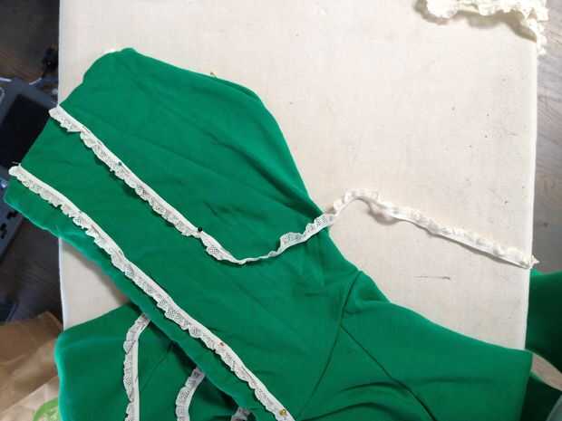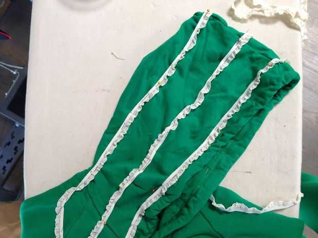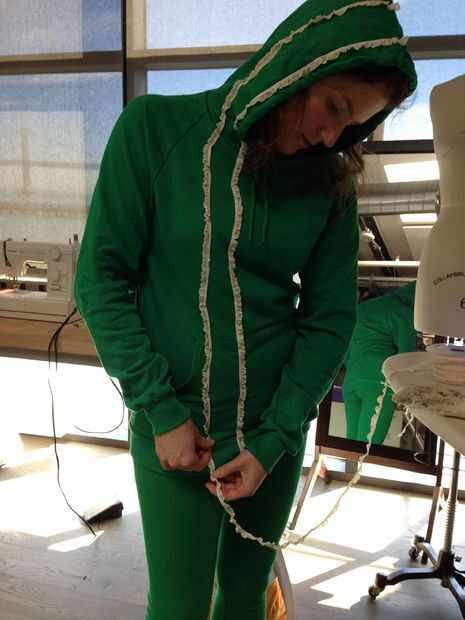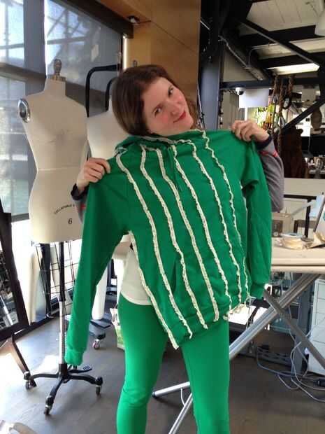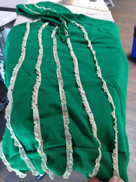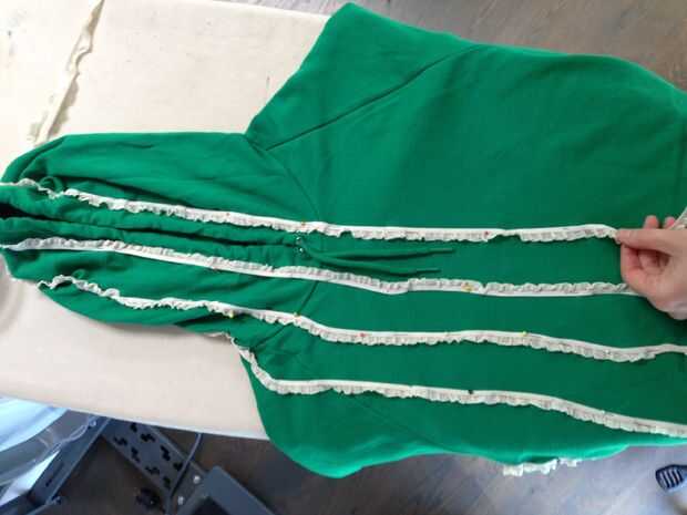 Vistiendo la camiseta verde con la campana arriba, comencé a fijar los volantes en la parte superior de la campana, a partir de la parte delantera derecha y trabajo todo el camino hasta la campana y la parte delantera derecha de la sudadera. Quería plan colmena colocación y espaciamiento con la sudadera en, por lo que he podido conseguir una mejor idea de cómo se vería realmente. Es un poco difícil para pin straight-ish líneas de volantes en una prenda de vestir que llevas actualmente, así que si tienes problemas, conseguir la ayuda de un amigo.