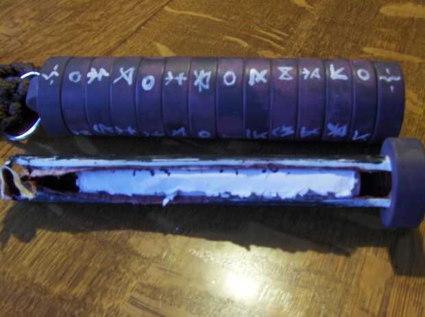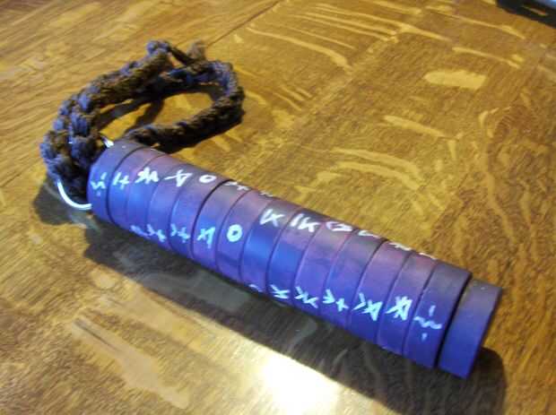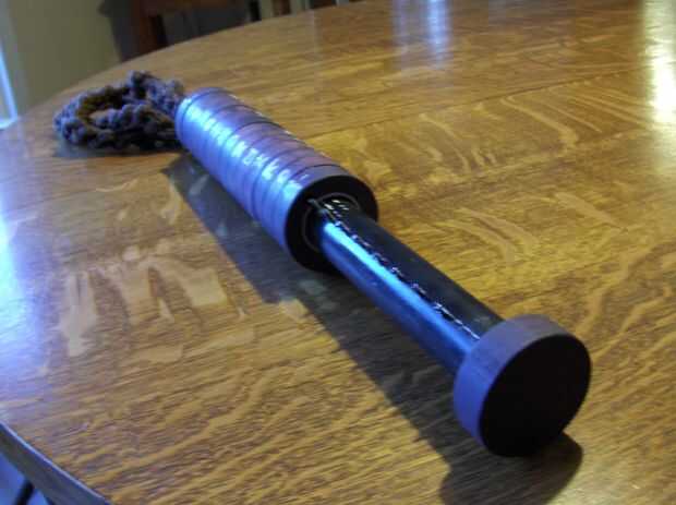 Bastante ha hecho de tubería de PVC y ABS, llaves con tornillos de máquina cortos, cubierto con trozos de pino y rematado con cordón trenzado macrame.