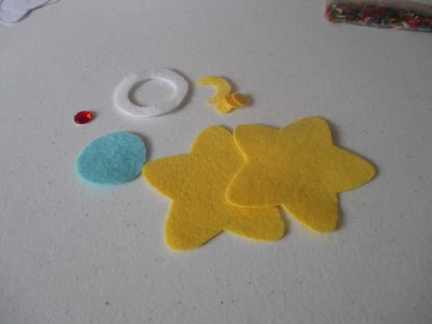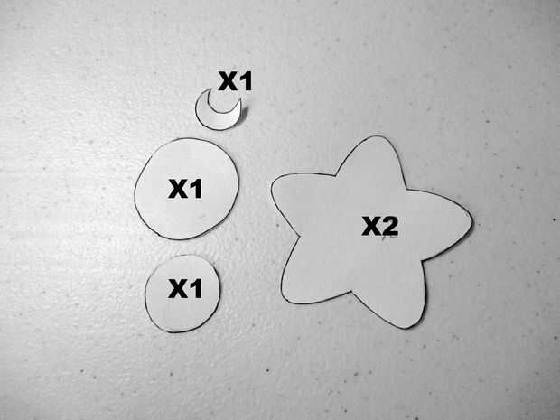 Corte piezas según el número el número en la plantilla. Poner círculo pequeño sobre el más grande círculo y traza. Cortar el interior, por lo que usted debe quedar con forma de anillo. Perno patrones en fieltro y recortar. Cortar las piezas con mucho cuidado. Las piezas de la capa como sigue: gran círculo, anillo y la luna. Cuatro círculos más pequeños son también necesarios, pero comentar estos.