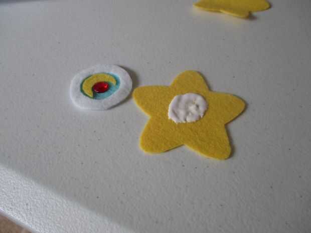 Añadir una cantidad generosa de pegamento en el centro de una de sus piezas estrella y pegamento abajo el pedazo de centro estrella. Si no han cortado sus círculos más pequeños, hacerlo ahora. Pegarlos en el centro de la estrella como se ve en la foto.