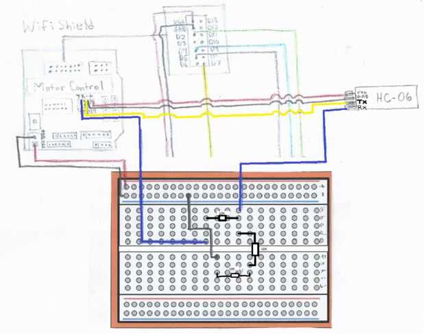 Para conectar la primera parte siga el diagrama de cable anterior. Comience por conectar el + y - los pernos en el Shieldv5.0 al VCC y GND y HC-06. Luego conecte un cable macho a macho puente a GND y VCC en el escudo hasta el final + y - las ranuras de la placa (como se ve en el diagrama).