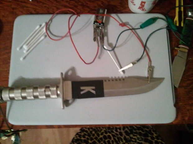 Tomar uno Cocodrilo clip y conecte un extremo a la parte positiva de la batería (mi clip rojo). Tomar el otro extremo y ponerla en una zona vacía de la hoja. Tenga cuidado donde la pones en la hoja, mina resbaló un par de veces.