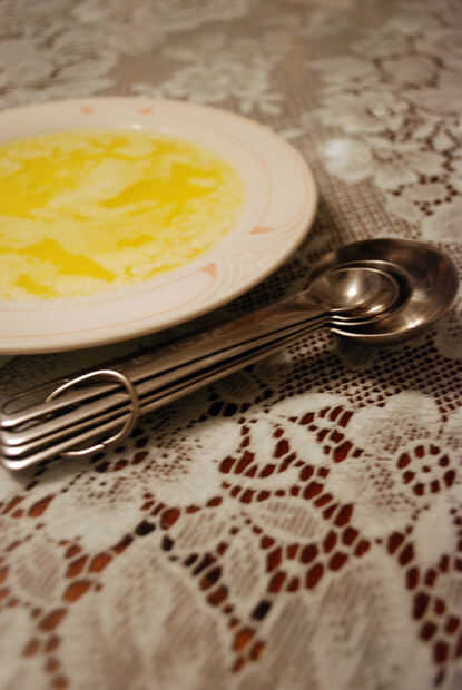 Derretir la mantequilla en el microondas en baja a media potencia durante un minuto aproximadamente.  El tiempo varía según la potencia del microondas.