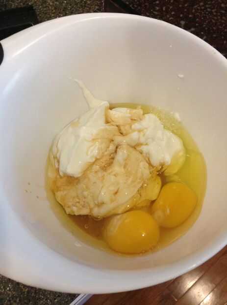 2 - en un bol mezclamos el azúcar, la crema agria (yogur griego), vainilla y huevos.