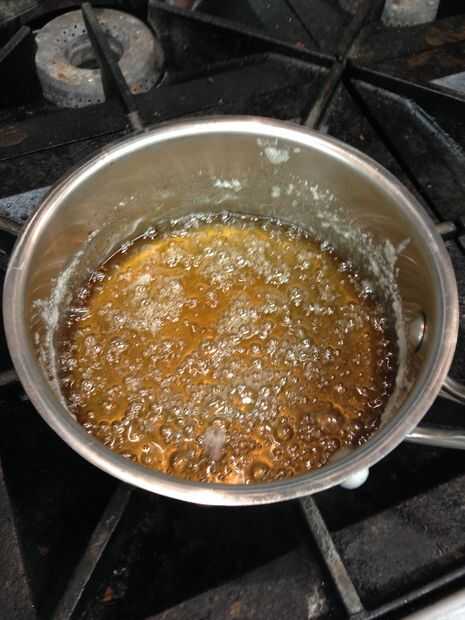 Continuar la cocción hasta que el caramelo alcanza un color ámbar oscuro y comienza a burbujear, unos 20 minutos.