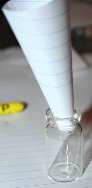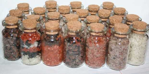 Es fácil llenar los tarros. Sólo hacer un embudo de un laminado en hoja de papel y la sal en la cuchara. Ayuda a aprovechar el vaso y el embudo sobre la mesa para obtener la Sal fluya más rápido. Compré varios tipos diferentes de sal y los mixtos para que yo pudiera tener diversos colores pero compré demasiado. Para 24 frascos usé aproximadamente media libra de arena.
