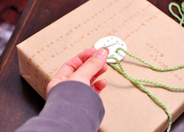Para el embalaje reciclado utilizar bolsas de color marrón. Para las "cintas" usé la manija de la cuerda de una shopping bag o trozos de hilo. Cuando el hilo por los agujeros de colocación use un pedazo de cinta scotch en los extremos para hacer una punta.