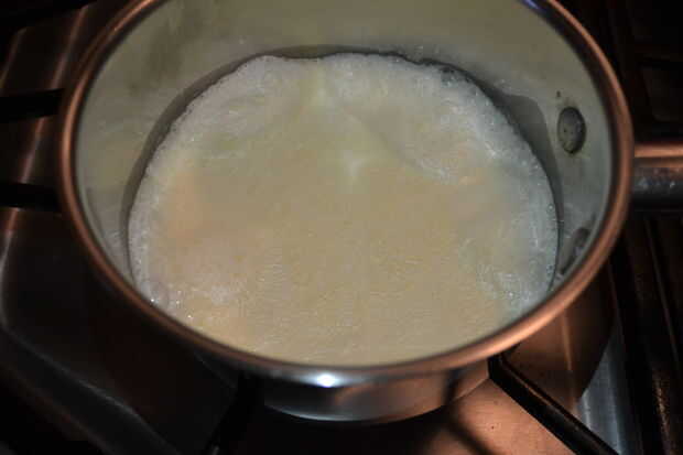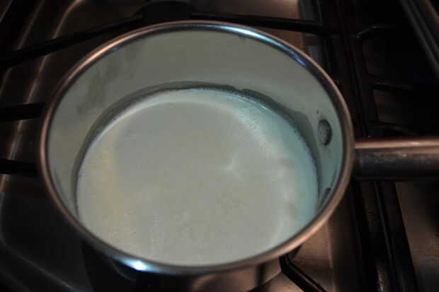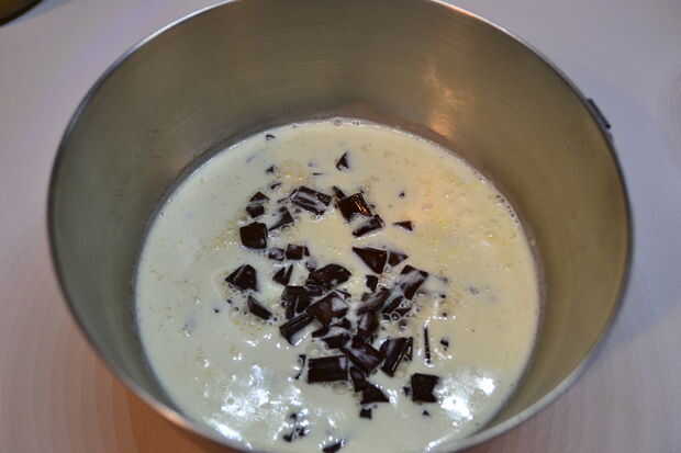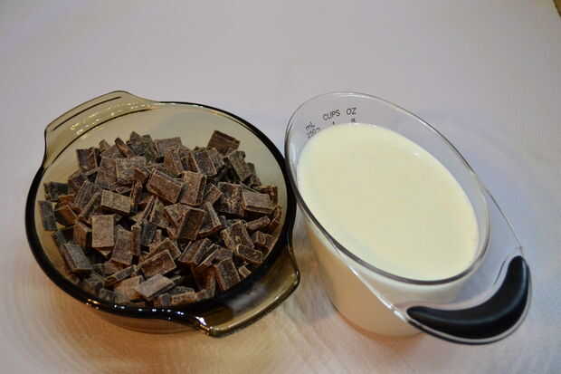 En una olla, poner a hervir la crema de leche. Cuando hierva, verter sobre el chocolate. Permite sentarse por unos minutos y luego usando un batidor, poco a poco batir el heavy y el chocolate hasta que quede bien mezclado. Deje que se enfríe completamente.