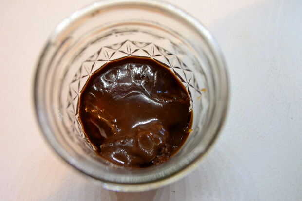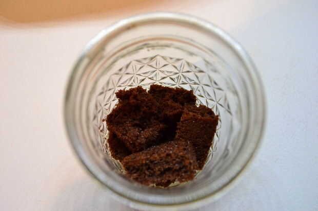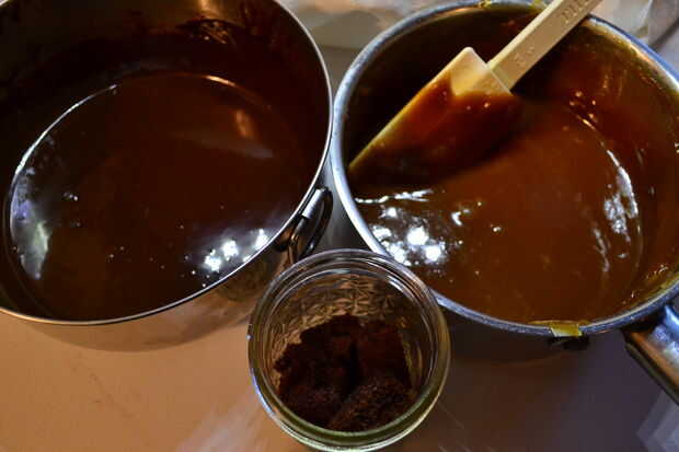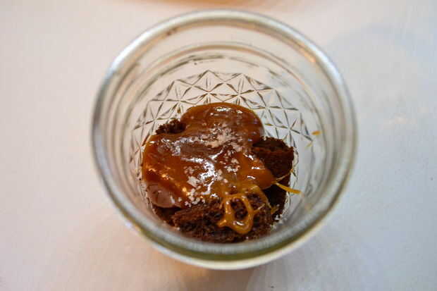 En un tarro de masón, capa en el orden siguiente: unos dados de bizcocho de chocolate, una cucharada de caramelo de sal, una pizca de Fleur de Sel, un par de cucharadas de ganache de chocolate, repetición.