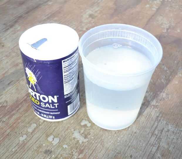 Calentar el agua y disolver la sal. La proporción de sal en agua debe ser aproximadamente de 1 a 5.