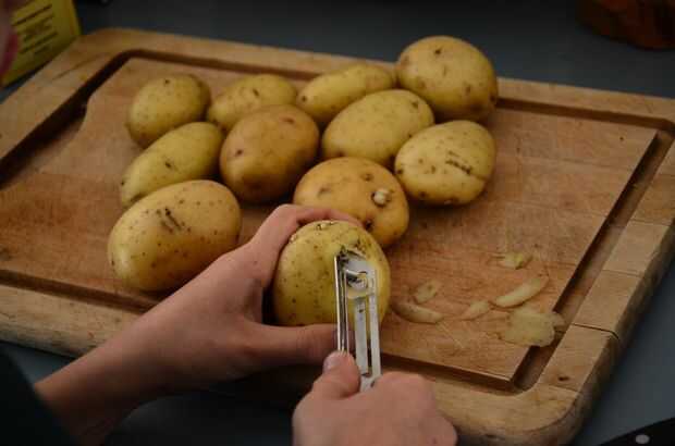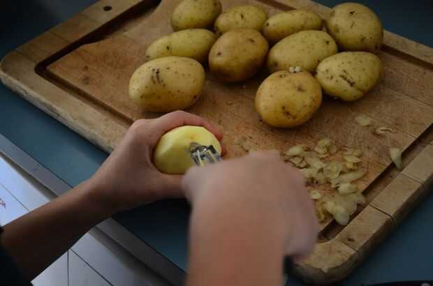 Tratar de no despegarse mucho de la patata. Puede haber algunos mini brotes que salen de las patatas. Si eso es cierto, plantar las papas o corte en el proceso.
