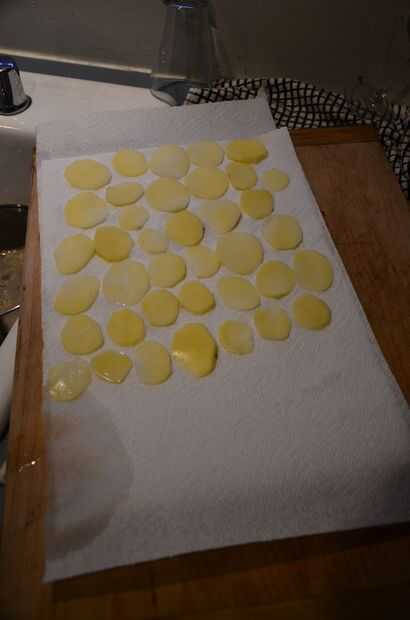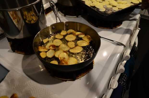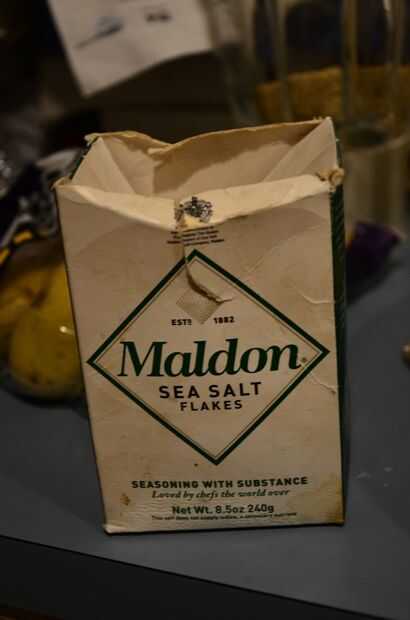 Después que Remoje las rebanadas, poner sobre una toalla de papel superpuestas y les seco pat. Frito mi patatas fritas en aceite de canola 100% Trader Joe. Espere hasta que las rodajas estén doradas y llevarlos a cabo. Como secarlas, ponerlas en una pieza superpuesta de toalla de papel y les seco pat. También se utiliza sal de Maldon que tienes que aplastar en los dedos. Poner en un cuenco y poner la sal y la pimienta en.