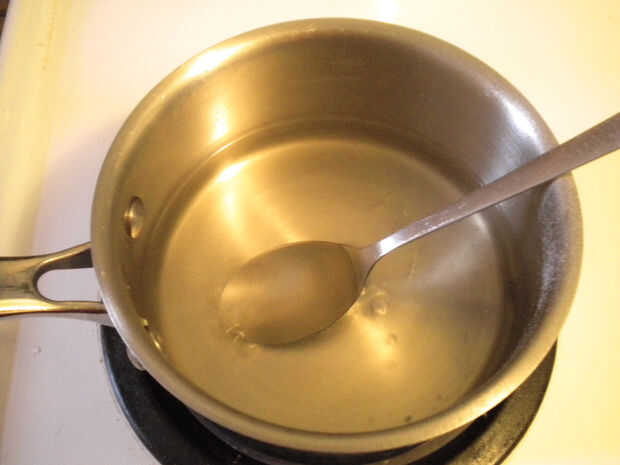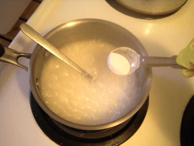 Calentar el agua y el cremor tártaro sobre fuego medio hasta que hierva ligeramente y añadir una cucharadita de Sosa a la olla. Te darás cuenta de un montón de burbujas y llena! Seguir agregando cucharaditas de Sosa a la solución hasta que alcanza su punto de saturación. Esto será pronto evidente como el burbujeo y llena se detendrá abruptamente después de agregar la soda. He añadido un total de 8 cucharaditas de mi Sosa casero para llegar al punto de saturación. Hierva esta solución sin cubrir durante 5 minutos que se evapore más el agua.
