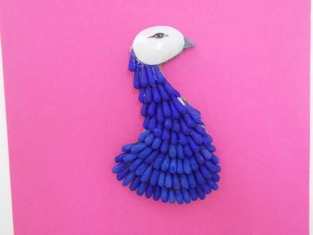 Pegar en el cuerpo de pavo real con un pegamento pistola y retocar con color es necesario.