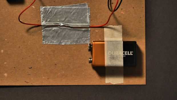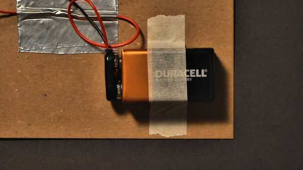 Utilizar cinta de enmascarar con cinta adhesiva la batería 9V cerca de una de las otras esquinas del conglomerado. Fije el clip de la batería a la batería de 9V. Para probar la alarma, tire de la pieza de conglomerado de la pinza para la ropa. Usted debe oír el sonido del zumbador.