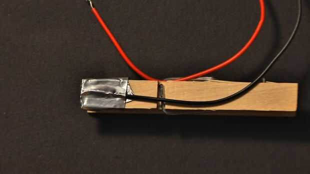 Cortar una tira de 1/2 pulgada de cinta de aluminio. Despegue el revestimiento de la cinta y abra la pinza para la ropa. A partir del borde exterior, envoltura de aluminio cinta alrededor de un lado, dejando el resto de la cinta colgando. Coloque el cable negro del clip de la batería de 9V en la parte superior la cinta de aluminio en el clip. Asegúrese de que el cable pelado toca el aluminio y terminar de envolver la cinta de aluminio alrededor de la pinza para la ropa.