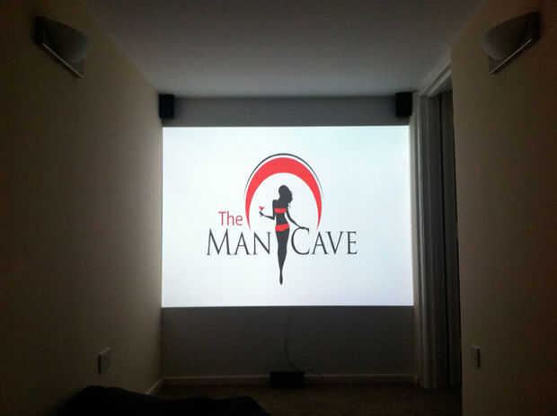 Lo que terminé con era un 6 pies por 4 pies proyectada 1080p pantalla, sonido envolvente, barra con cerveza bomba y óptica, de la esquina sofá y pufs.