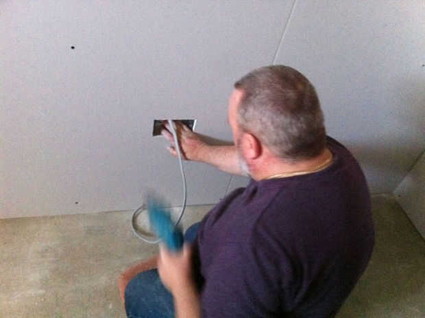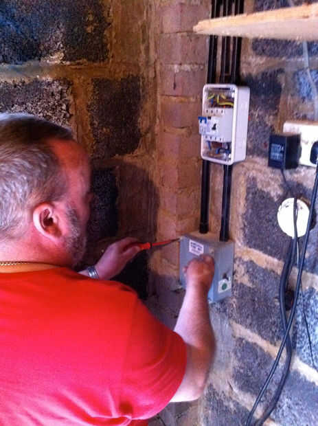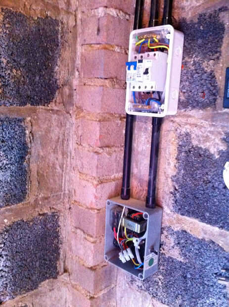 En este punto mi electricista equipado también una nueva caja de fusibles y RCD elemento por lo que sería menos probable que suicidarme. Además puso en un interruptor que estaba podrido del equipo que retiró el antiguo estudio de grabación. Esto recorta o enciende las luces cuando se activa un interruptor 9v - en este caso, el timbre de la puerta. Obviamente en una sala de cine externa al edificio no oyes un timbre débil, por lo que las luces intermitentes son la mejor solución!