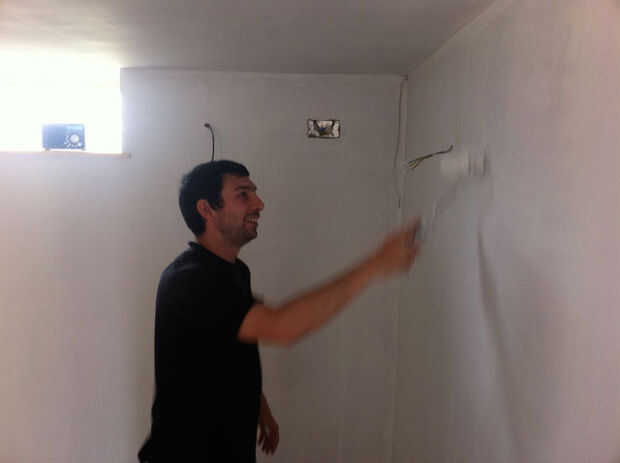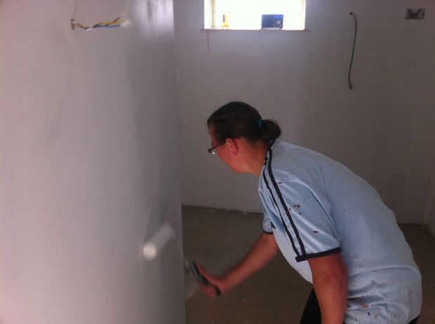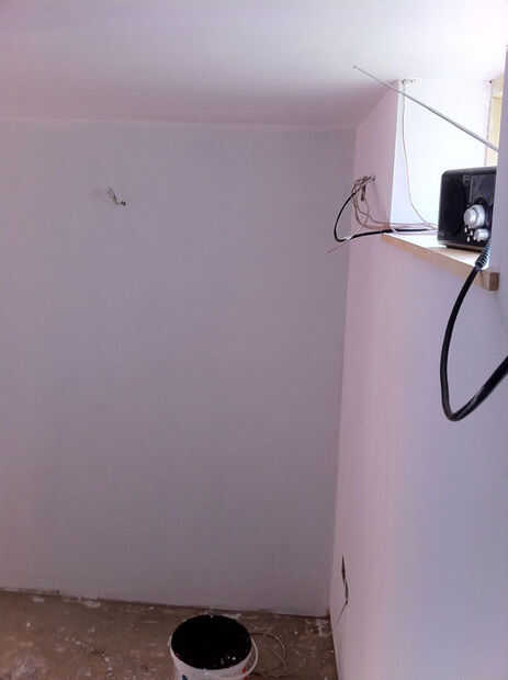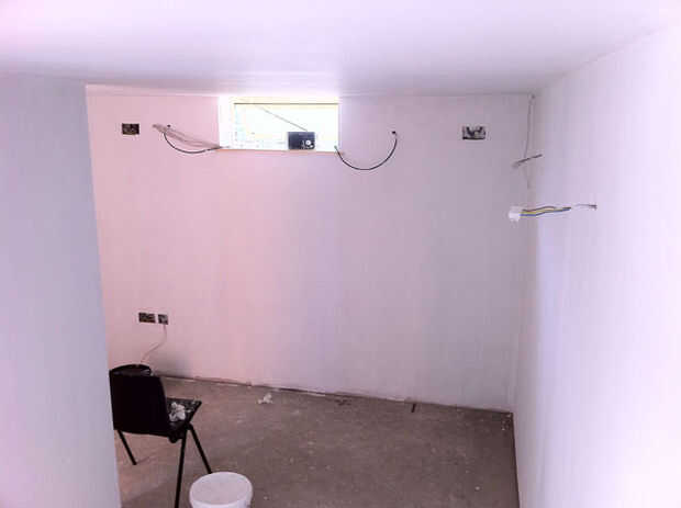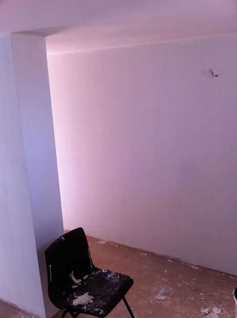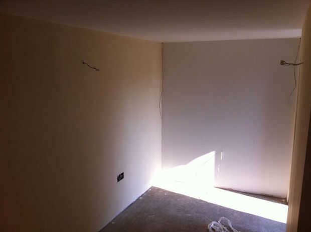 Como sólo habíamos tenido una capa superior delgada de yeso en las paredes esperamos pocos días antes de que el yeso estaba secado. Se utilizó una mezcla de pintura y agua 50: 50. Dos capas de esta mezcla fina le dio una buena base para las paredes. Todas las paredes enyesadas bar uno fueron pintados con magnolia - la pared del proyector fue pintada blanco brillante.