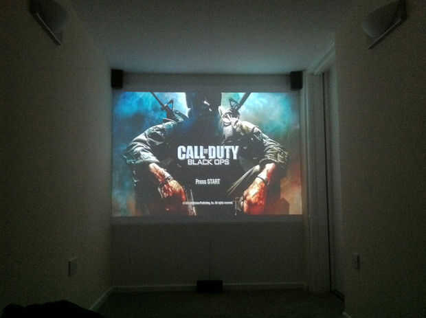El proyector es un proyector de 1080p Acer, juntado con un sistema de sonido envolvente de 5.1 Onkyo que el efecto es como si estás en tu propio cine privado. El proyector se encuentra en un estante de vidrio y el amp y xbox se sientan en un estante encima de mi escritorio.