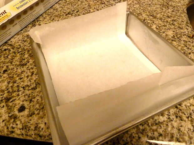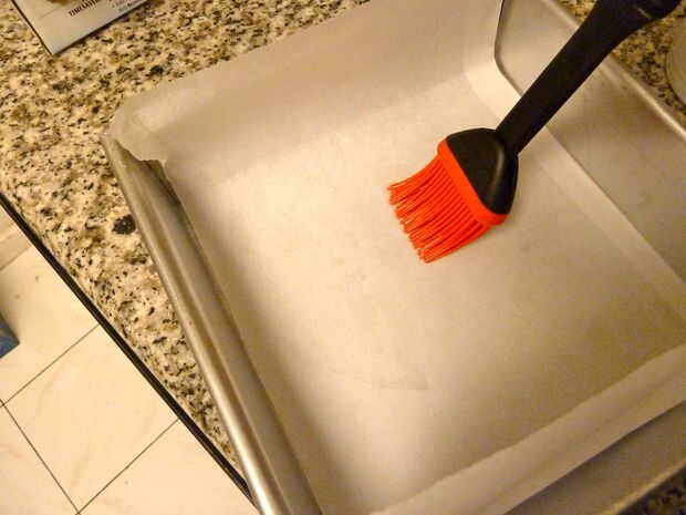 Antes de comenzar, ¿por qué no preparar el pan? Esta manera, pueden dedicar su tiempo para asegurarse de que usted mira ese termómetro de caramelo! Sin necesidad de distracciones añadidas. Cortar el papel de pergamino como se muestra en la imagen siguiente. Una vez que incorpora, pedacitos de largo sobre el borde, cepille ligeramente aceite vegetal sobre el papel de pergamino.