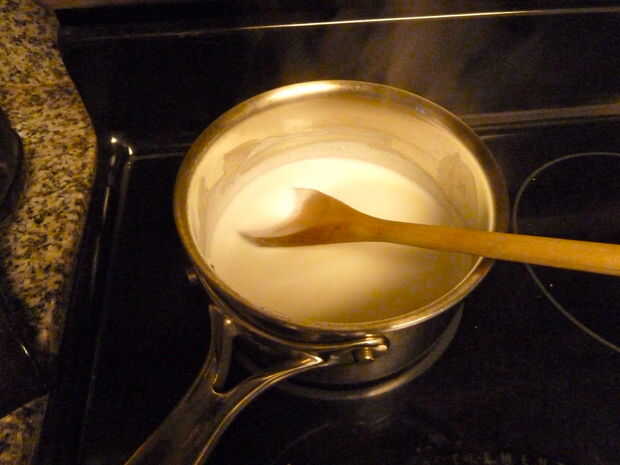 Mientras que está recibiendo, vierta la crema y la mantequilla en otra cacerola y calor en medio hasta caliente. La crema se calienta antes de hace el azúcar, así mantener la crema en el bajo, que no se queme (aunque, si recuerdo, crema no quema como la leche debido a la grasa en lo... o algo).