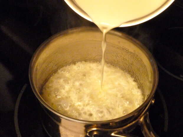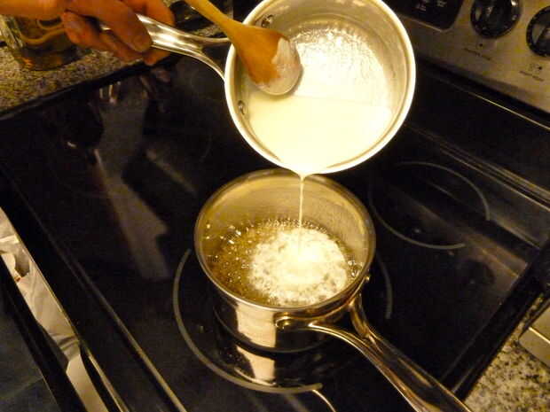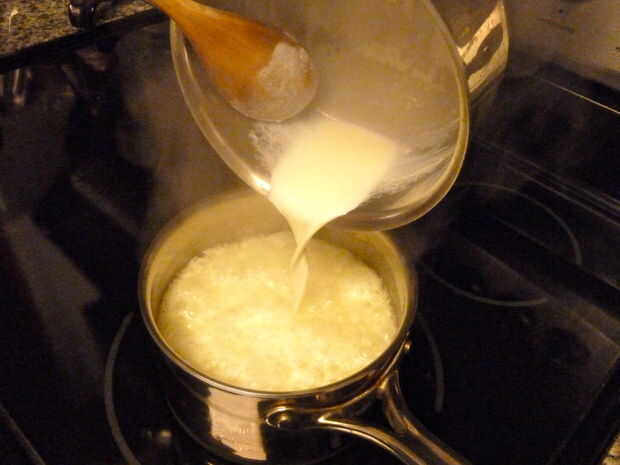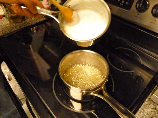 ¿Recuerdas cómo te dije para conseguir una cacerola que era por lo menos 6" de ancho y 4.5" profunda? Bueno eso es porque cuando llega el momento de poner la crema con la salsa de caramelo, la mezcla de los dos fluidos causa violentamente la burbuja y se duplicará en tamaño. Pero no te preocupes, no burbuja sobre (si tienes una olla bastante profunda) y se establecen poco después.