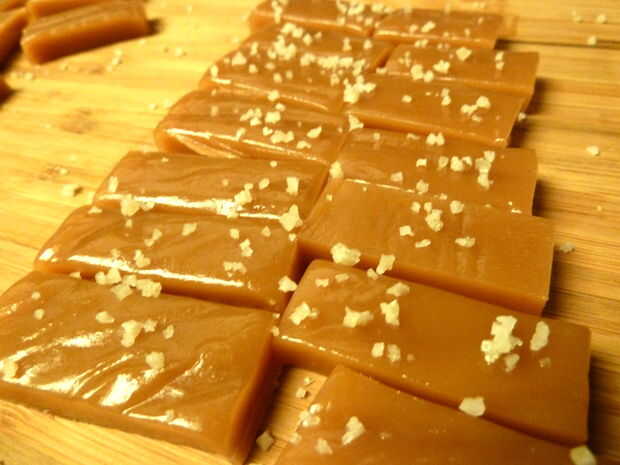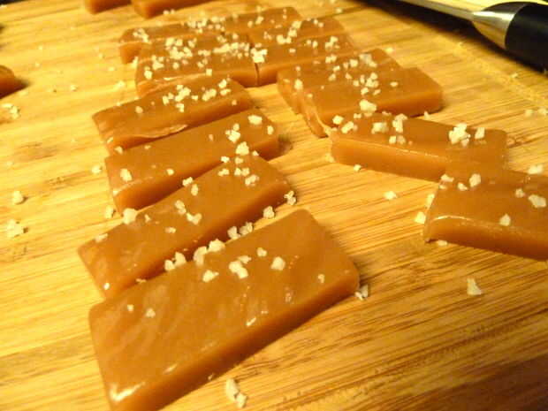 Espolvorear los trozos de caramelo con sal de mar. Estoy usando sal marina gruesa, pero si han desmenuzado sal de mar, que se ve muy bien también.