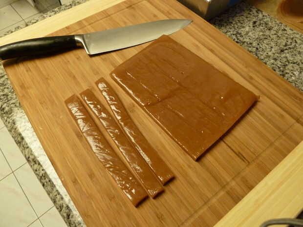 Luego tomando un cuchillo bonito, grande, fuerte, cortar el dulce en trozos más pequeños de tu agrado.