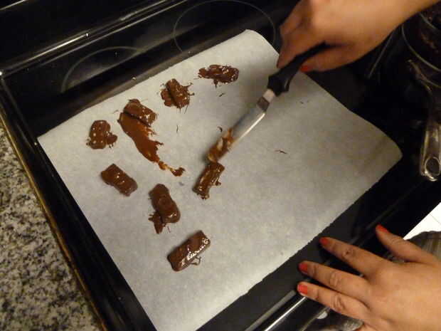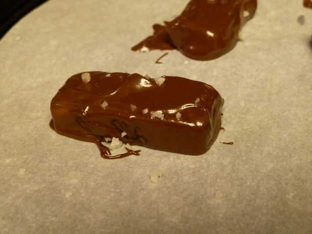 Yo la plopped un pedazo de caramelo en el chocolate y la cubierta. Entonces colocó cuidadosamente en papel pergamino y mientras que el chocolate estaba todavía húmedo, había espolvoreado la sal del mar sobre ellos.