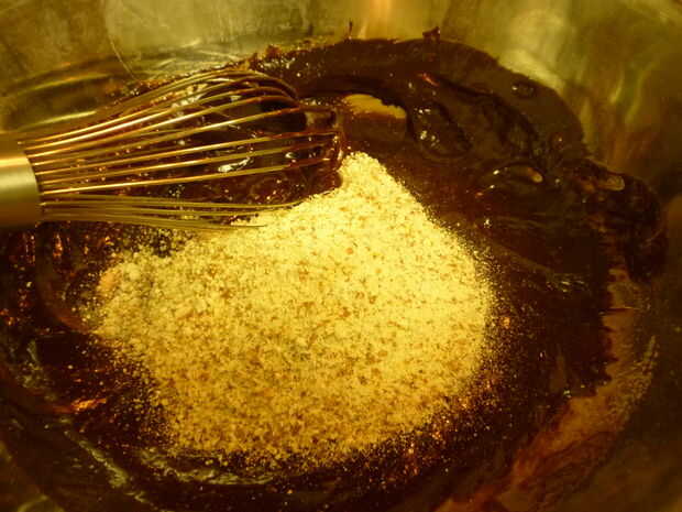 Por último añadir la harina de almendra. Una vez que se ha añadido la comida almong, mezcle con una cuchara de madera.