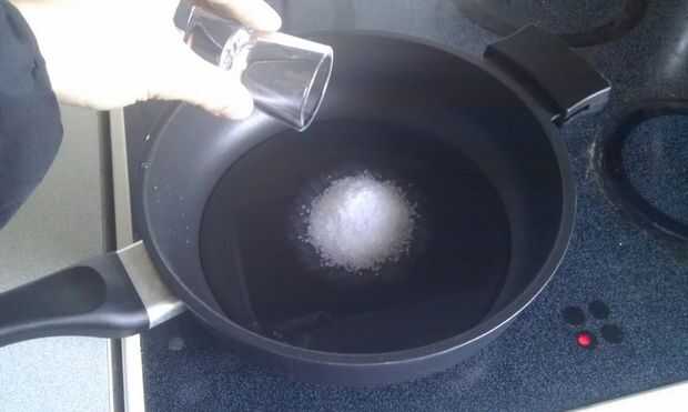 Mientras tanto poner el agua y la sal en una cacerola y calentar.