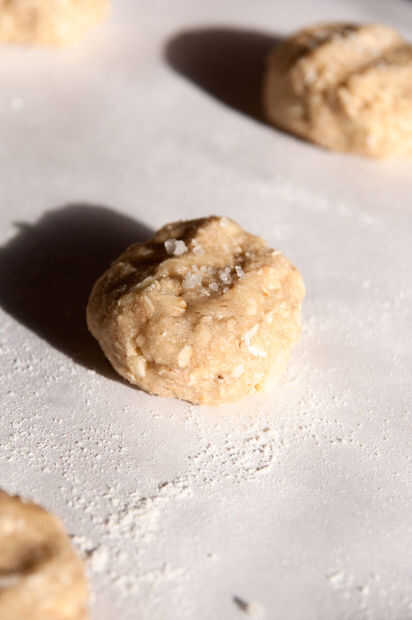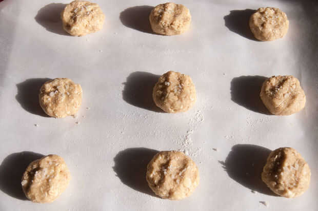 Pulsa las bolas de masa de la galleta ligeramente y espolvorear con una pizca pequeña de sal marina.
