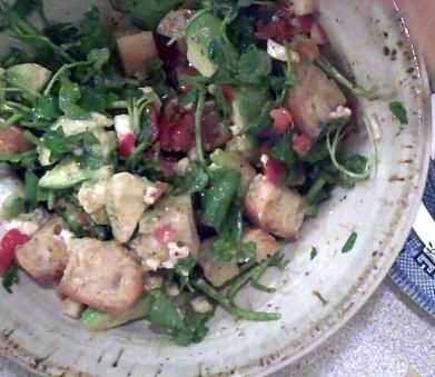 aquí es una receta para una ensalada de verdes como berro de agua, baby arugula o azúcar complemento guisantes, aceite de oliva empapados trozos de pan rústico, fresco y ahumado, mozzarella y aguacate. El nombre Rossoni origina de la región de Ferrara de Italia.