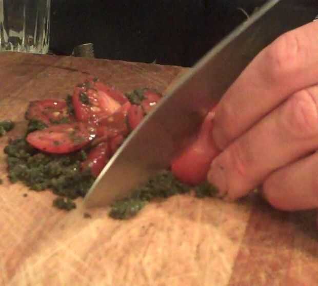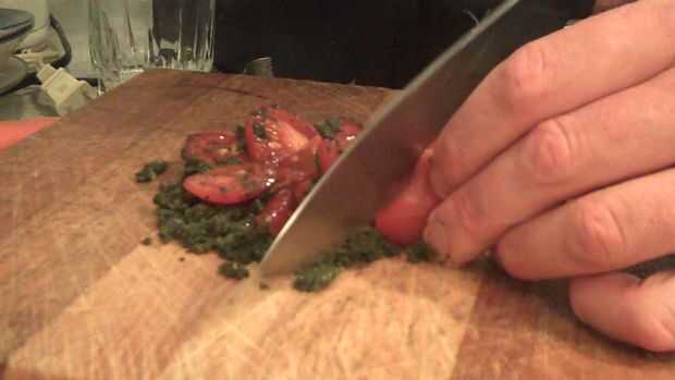 Chop 20g basil. Cortar 500g tomates sabrosos Tom encima la albahaca picada. Poner la mezcla de albahaca y tomate un frasco y añadir el vinagre de vino rojo 50g, sal y pimienta al gusto. Cortar los tomates más en el frasco, mezclando de vez en cuando. La vinagreta puede ser refrigerada y utilizada para preparar ensaladas varias.
