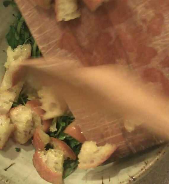 Agregar trozos de pan encima de los verdes. El aceite sobrado en la placa puede frotarse en la madera de la tabla de cortar (que es lo que está sucediendo en la película en este momento).