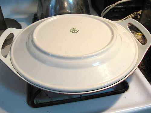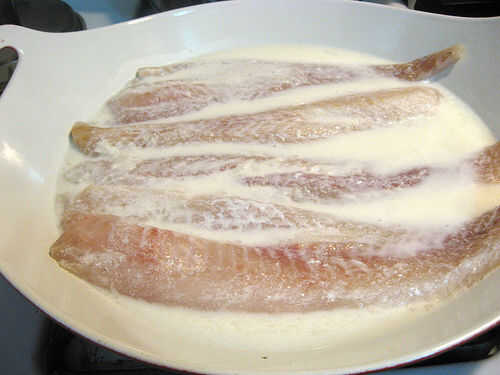 En una sartén saltear los filetes de pescado de lugar. Mezclar 1 pinta de crema y 2 tazas de vino blanco y 1/4 de jugo de limón recién exprimido. Vierte la mezcla de crema vino sobre peces hasta que los peces solo están cubiertos. Hacer hervir un líquido, cubrir el pescado y pochar durante 5-10 minutos hasta que el pescado se convierte en firme. No tengo una funda para este pan, por lo que acababa de usar un plato.
