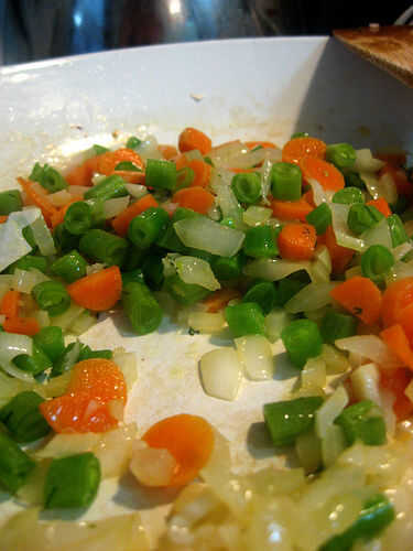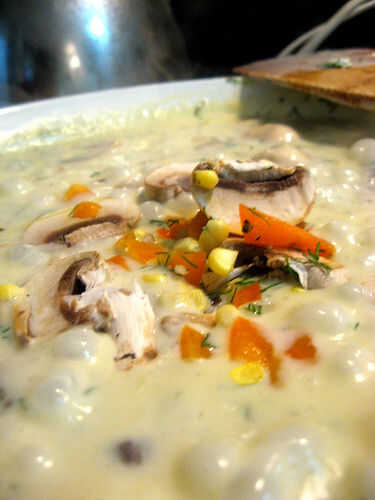 Una vez que la salsa es lo suficientemente gruesa, añadir el resto de verduras; setas, pimientos, maíz y el eneldo.