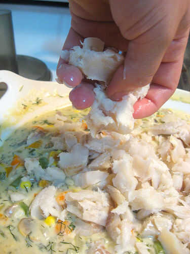 Por este tiempo, el pescado debe ser enfriado. Pescado y romper en trozos más pequeños y añadir a la salsa.