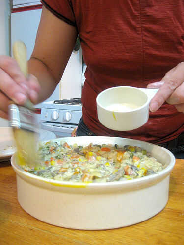 Vierta la salsa de relleno en una bandeja de tarta o pastel. Separar una yema de la clara del huevo. Usando la yema de huevo, cepillo de los bordes de la tarta o pastel de pan para ayudar a sostener y sello de la corteza a la tartera.