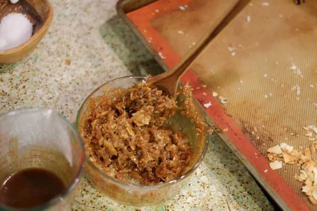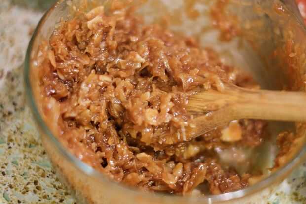 Añadir todos del coco azucarado blanco y cerca de la mitad del coco no endulzado tostado en su caramelo. Reservar la otra mitad del coco no endulzado para guarnición.
