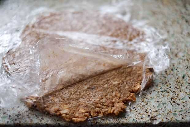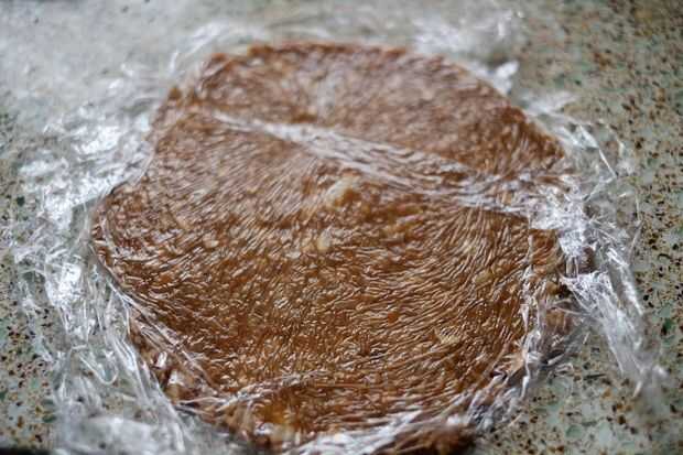 Lugar la bola de caramelo de coco entre dos capas de saran wrap.