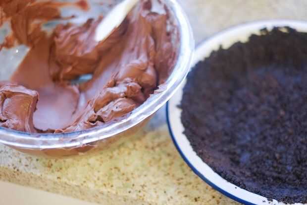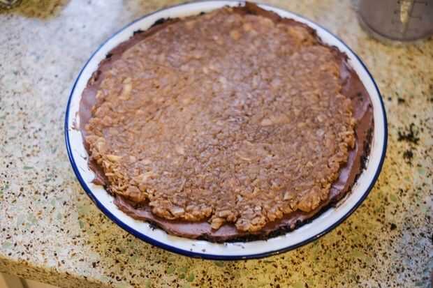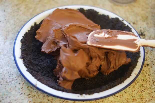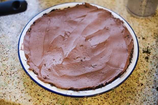 Con una espátula de goma, extender una capa incluso agradable, densa. Rellenar la tarta en la parte superior. Lisa lo mejor que puede.